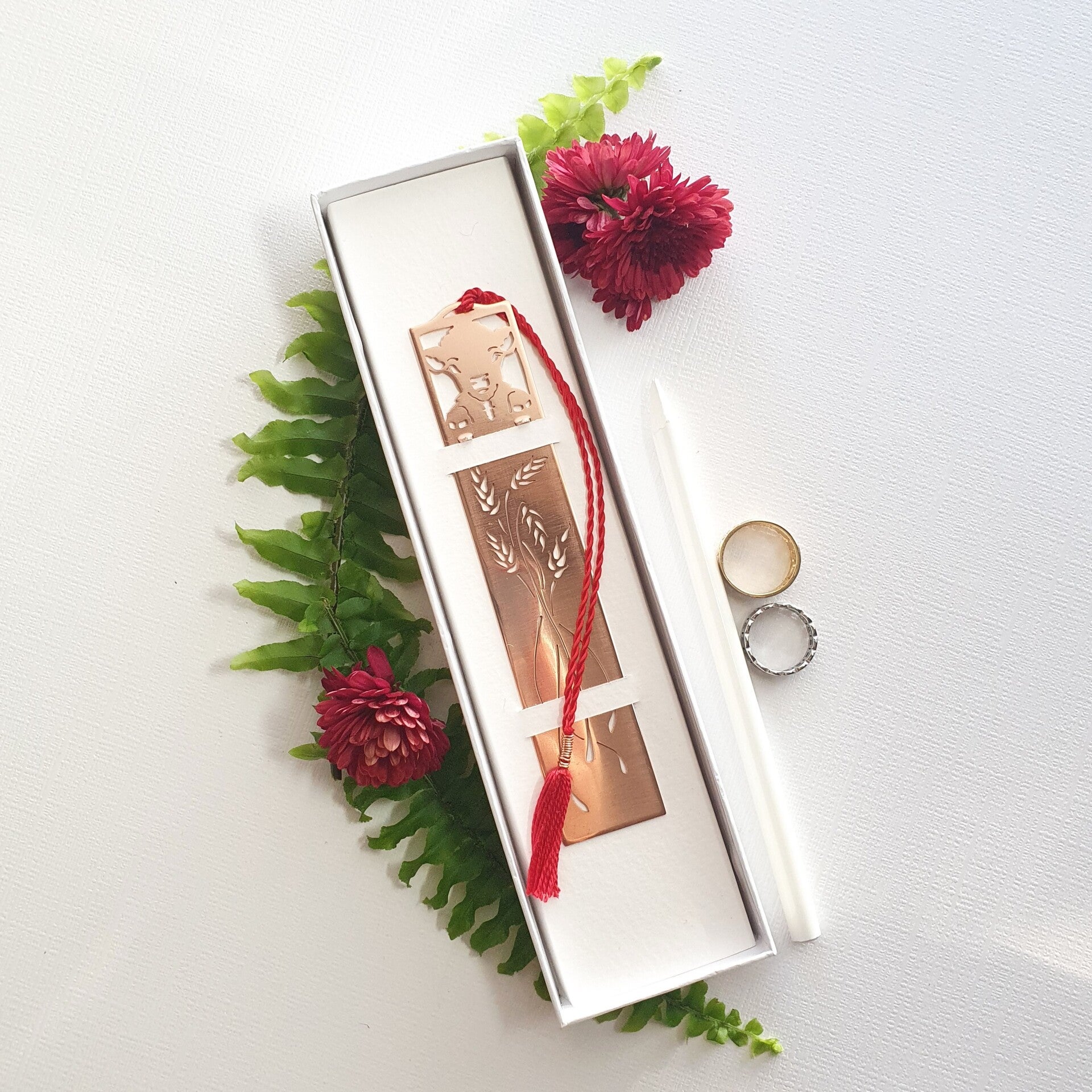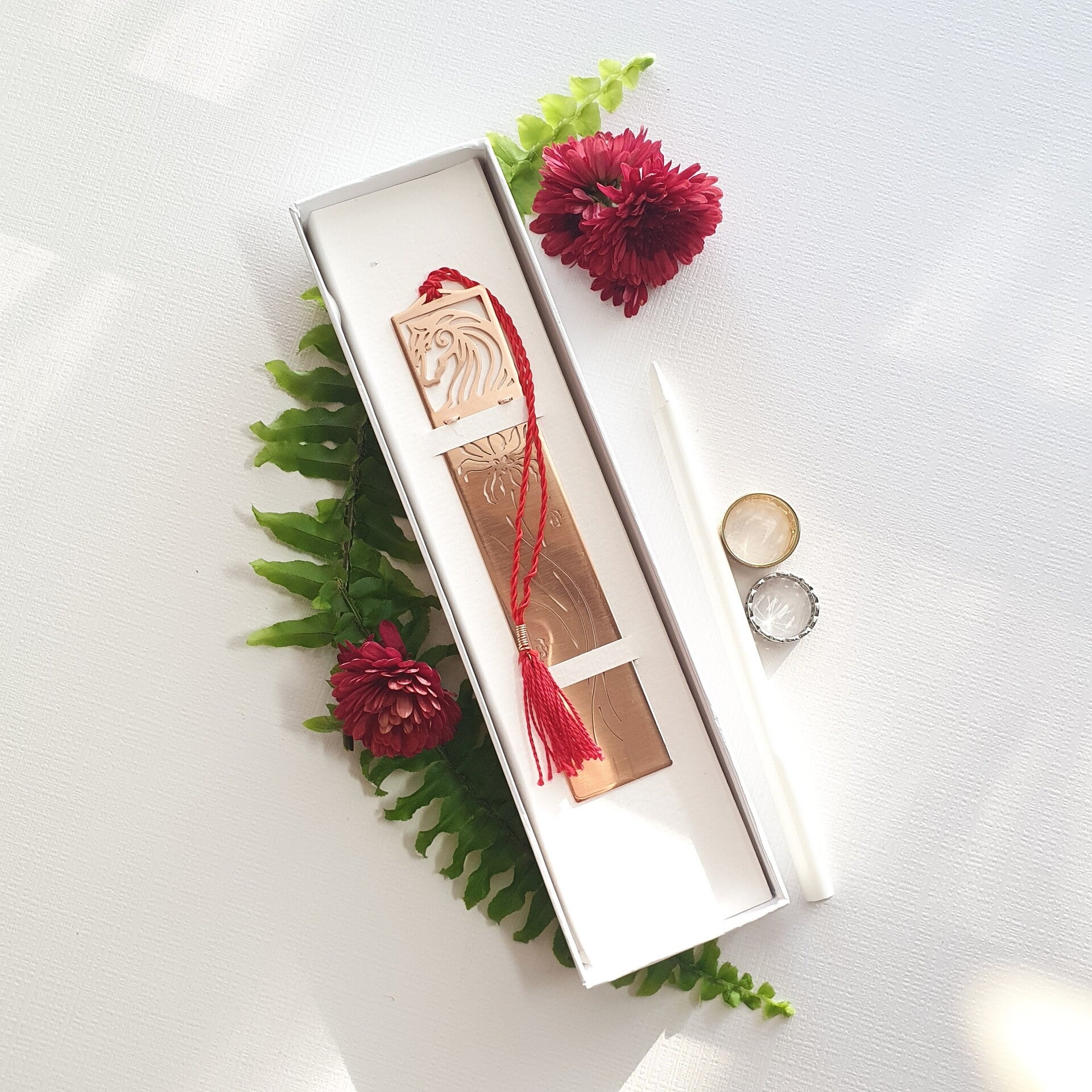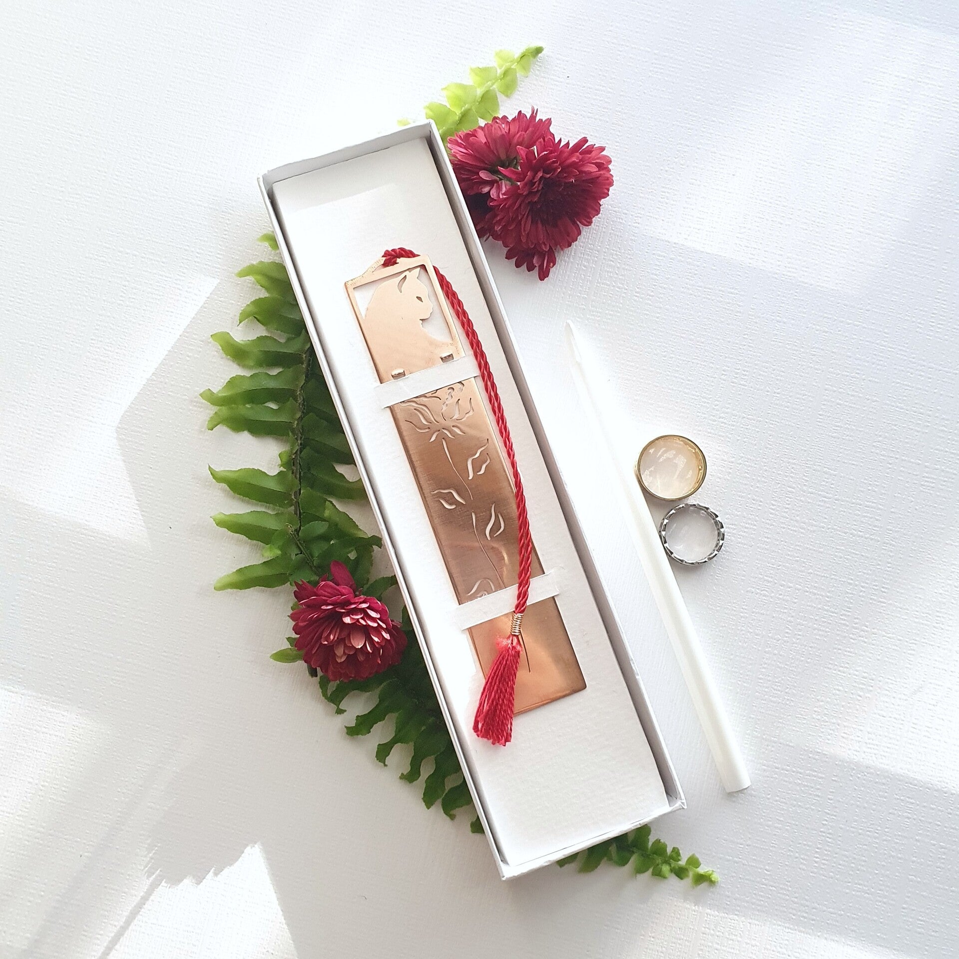 Crafted from copper, each bookmark is distinctive, changing its appearance based on its surroundings and the level of handling it receives. You may marvel at the beautiful transition from a lovely rose gold hue to shades of orange, red, brown, blue, and purple. A polishing pad is included for those who wish to restore the copper's original light pink shade, just keep in mind that some marks may remain, as your fingerprints can leave a lasting impression. But that is just the charm of copper.